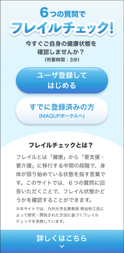 この度、マクニカが提供を開始するフレイル予防サービス「MAQUP」は、Web上で6つの質問に回答することでフレイル状態を早期発見し、地域の運動プログラム提供パートナーと共同で、健康の維持とフレイル状態の改善を目指す運動プログラムを提供するものです。
