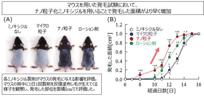 今回開発した本ナノ製剤による発毛効果を、マウスを用いて評価しました。その結果、本ナノ製剤は従来のローション剤と比較して、より早期かつ顕著な発毛促進効果をもたらすことが確認されました(図3)。