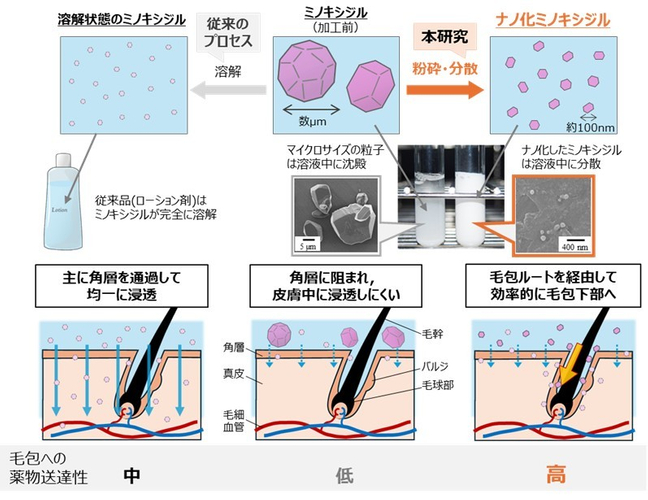 大正製薬と近畿大学長井教授の研究室はこれまでに、ミノキシジルを直径約100nm(1nm(ナノメートル)は100万分の1mm)の大きさまで微細化(ナノ粒子化)することによって、ミノキシジルの毛包への移行が促進され、発毛効果が早期に発現することを明らかにしてきました。今回、食品添加物や医薬品添加物として広く用いられている「アラビアガム」を新たに配合してナノ粒子化することによって、ミノキシジルをナノ粒子化するための粉砕効率や製剤の品質(分散安定性など)を維持しつつ、製剤の粘度を約30分の1まで低減させることに成功し、外用剤としての使用感を改良できる可能性を見出しました。