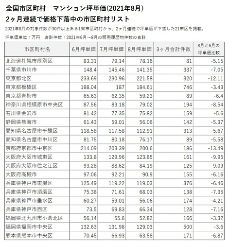 ・2021年6月から2ヶ月連続で下落したのは21市区。