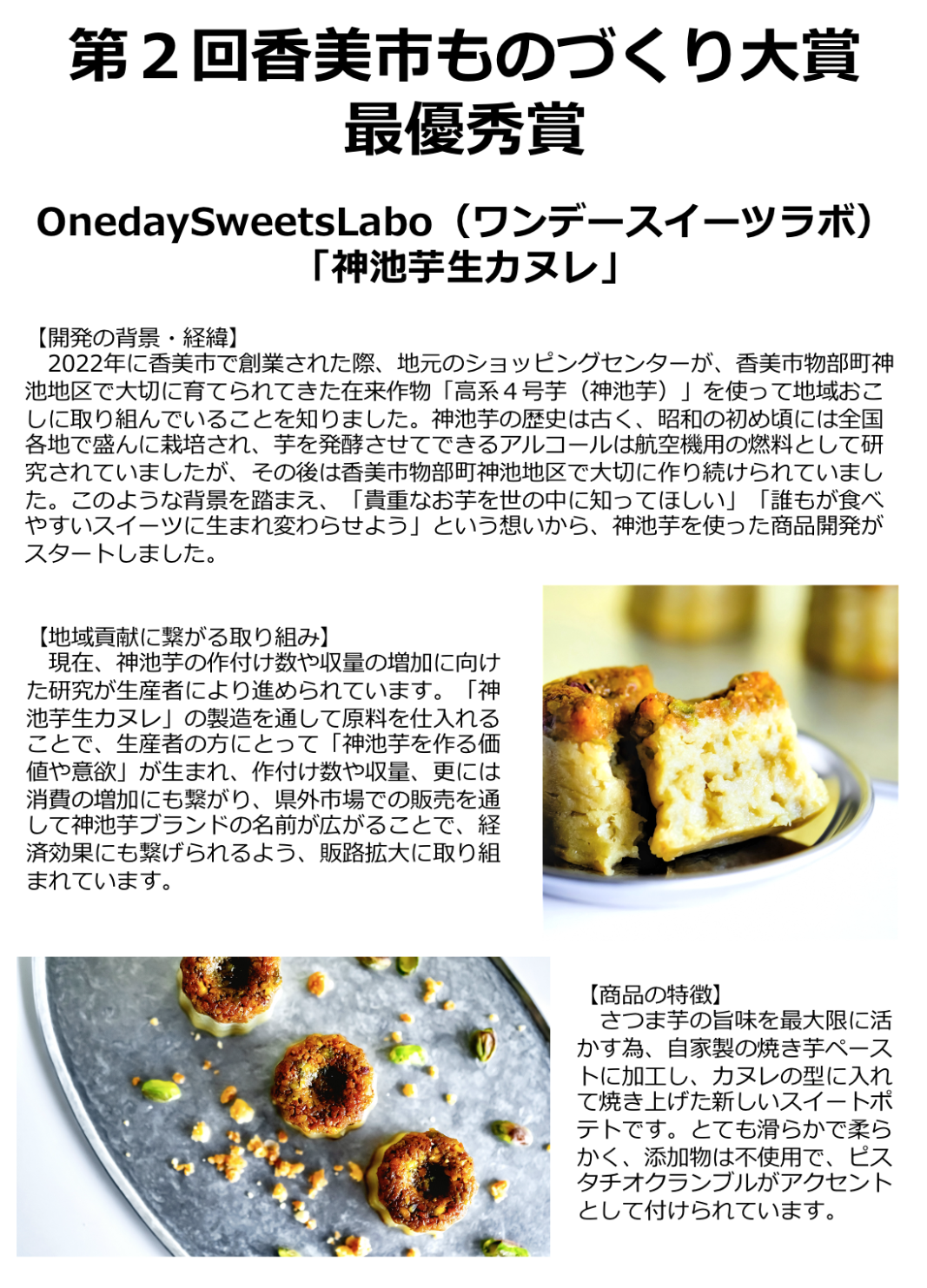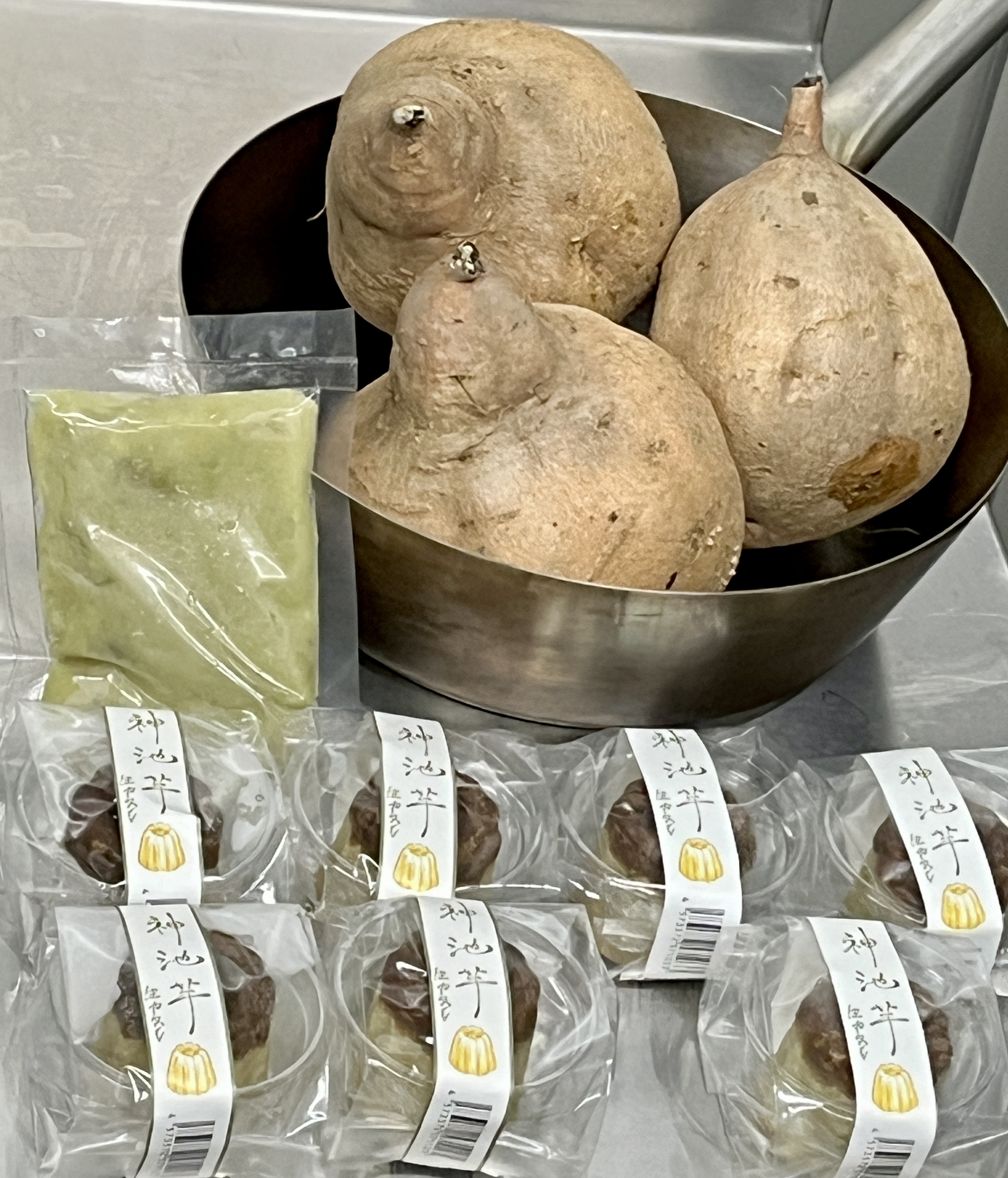 発見された神池地域の名前を商品名に入れ、広めたいと考え、スイーツ部門での『神池芋(カミイケイモ)』を商標出願し登録されました。