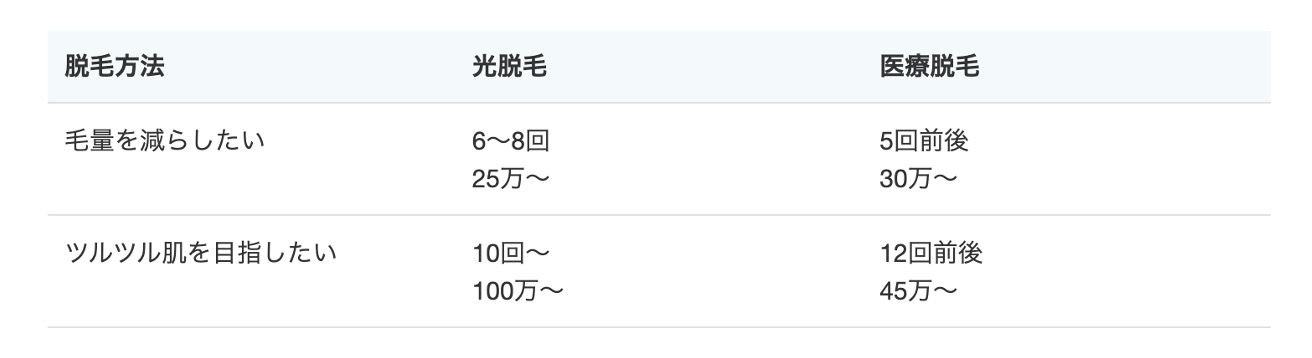 以下に、目指す肌状態ごとに必要な回数と料金をまとめました(脱毛は個人差があるため、あくまでも目安としてお考えください)。