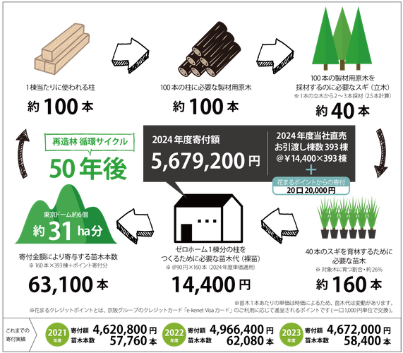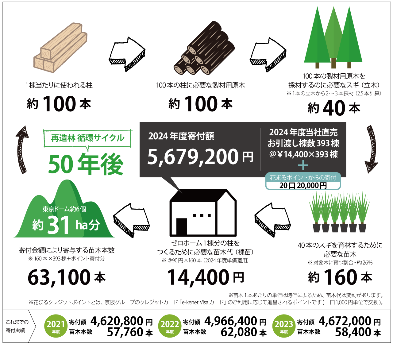 株式会社ゼロ・コーポレーション(本社:京都市中京区、社長:菊本雅幸、以下「ゼロホーム」)は、宮崎県のスギ植林・育林を目的とする再造林支援2024年度分として、約567万円の寄付金の贈呈を2024年12月に行いました。この寄付は、ゼロホームが独自で進める「苗木を還そうプロジェクト(以下、「苗木プロジェクト」)」の一環として2021年にスタートし、今回で4回目です。同プロジェクトにおけるこれまでの寄付金合計は、約1993万円となりました。