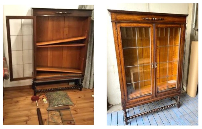 今回の福島県沖地震でキャビネットが転倒し破損した状況を目の当たりにした時は大きなショックを受けました。とても気に入っていたキャビネットのため、何とか修復できるところが無いかと色々と探したのですが、ステンドグラスの修復をしているところは無く諦めていたところ、ファニチュアヒロシさんのホームページを拝見し、アンティーク家具の修復、さらにステンドグラスの修復も行っていることを知り、キャビネットの修復を依頼しました。修復されて元通りになって戻ってきたキャビネットを見てとても感激いたしました。粉砕されたステンドグラスも綺麗に修復されており、雰囲気も損なわずに以前の状態に戻っていました。家具の歪み・隙間もきちんと修復されており、また欠損していた部分も元通りになっていました。見事な修復技術にとても感心いたしました。