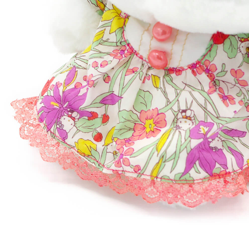 リバティプリントのリボンとワンピースの生地の絵柄には、たくさんのキティちゃんが隠れているのが特徴です。