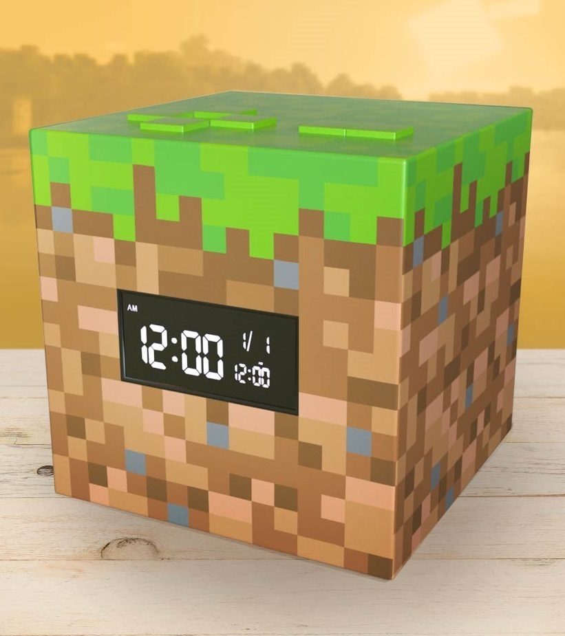 スヌーズ機能もついたマインクラフトの草ブロックデザインの目覚し時計です。