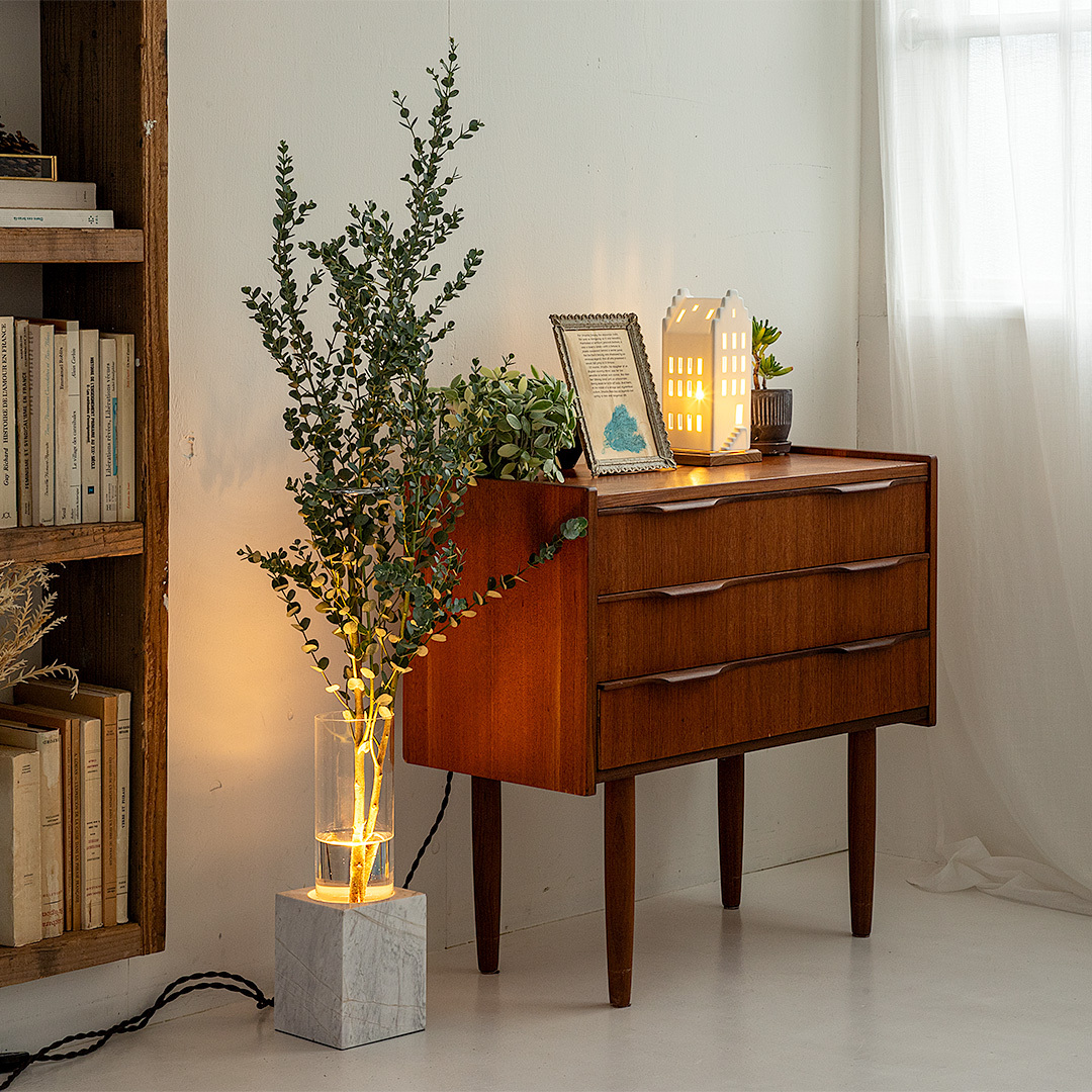 優美な大理石のキューブから立ち上がる光が、植物の姿をいっそう美しく照らし出します。