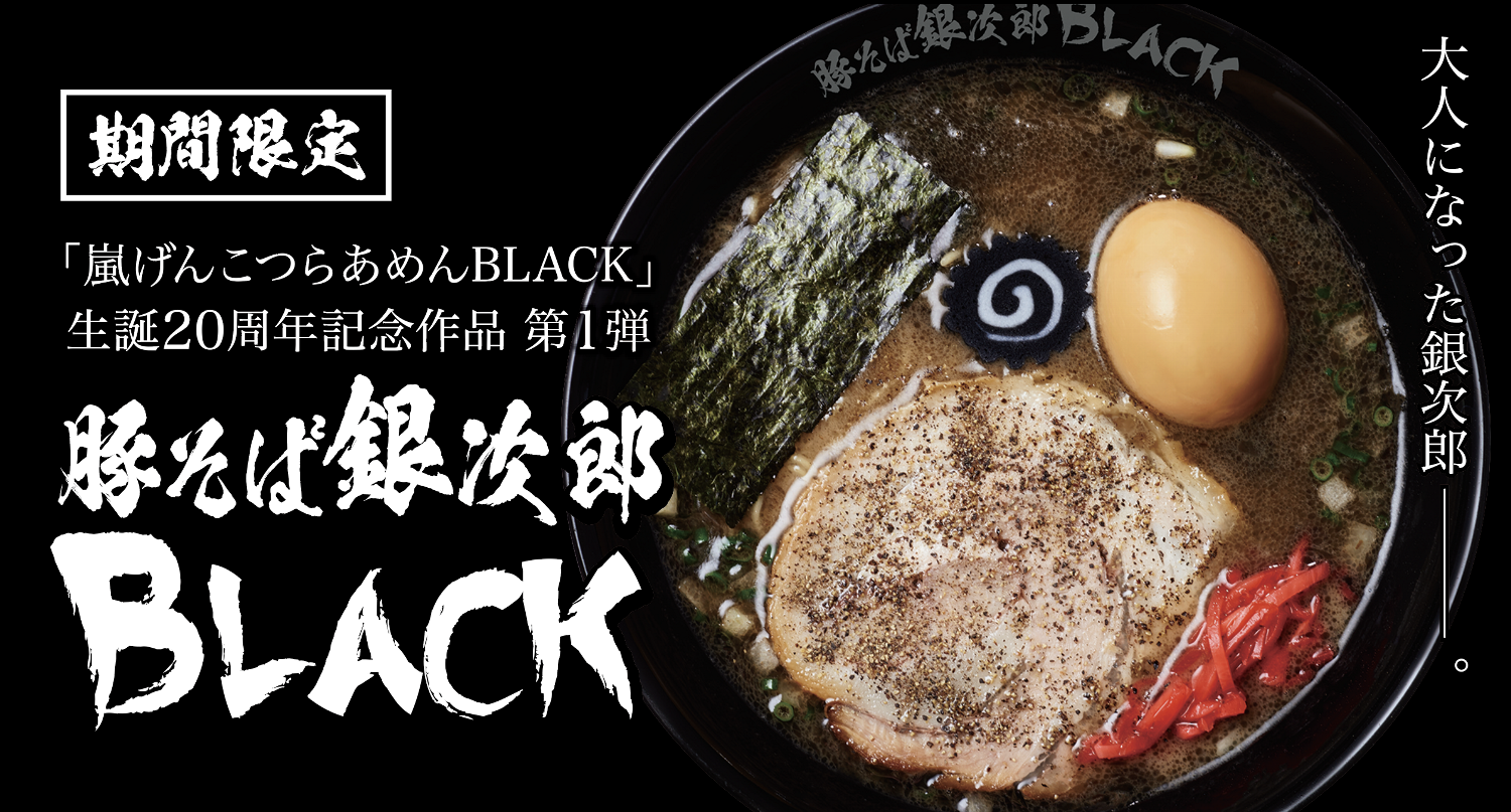 「嵐げんこつらあめんBLACK」生誕20周年記念作品第1弾 『豚そば銀次郎 BLACK』3月15日(水)より期間限定で販売開始!