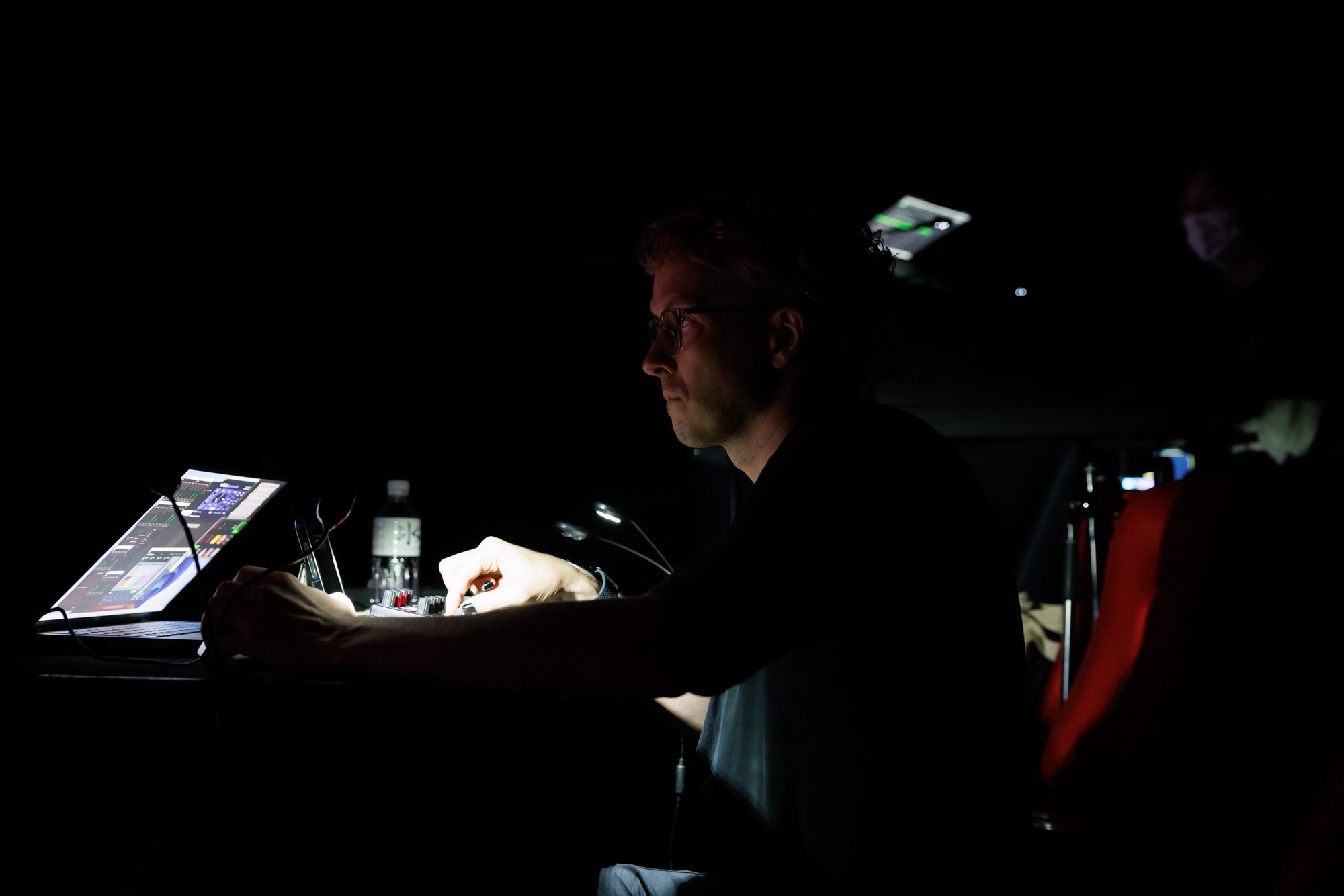 ベストミュージックアニメーション賞審査の合間で行われた特別イベント、インターナショナルコンペティション部門入選作家であるメディアアーティストのマックス・ハトラー氏による音と映像の単独ライブを開催しました。「オプティカルサウンド(光学音響)を使用し、映像から音楽が即興で表現されていくもの」とのハトラー氏からの解説の後、スペシャルライブが行われました。連続して明滅するビジュアルにシンクロするノイジーな音を全身で感じる30分間となりました。