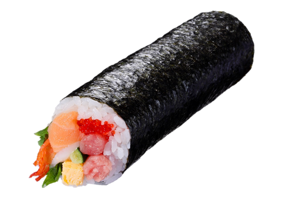 生本まぐろ中とろ・生サーモン・海老・ぶり・紋甲いか・炙り穴子が入った魚屋ならではの贅沢な海鮮太巻。