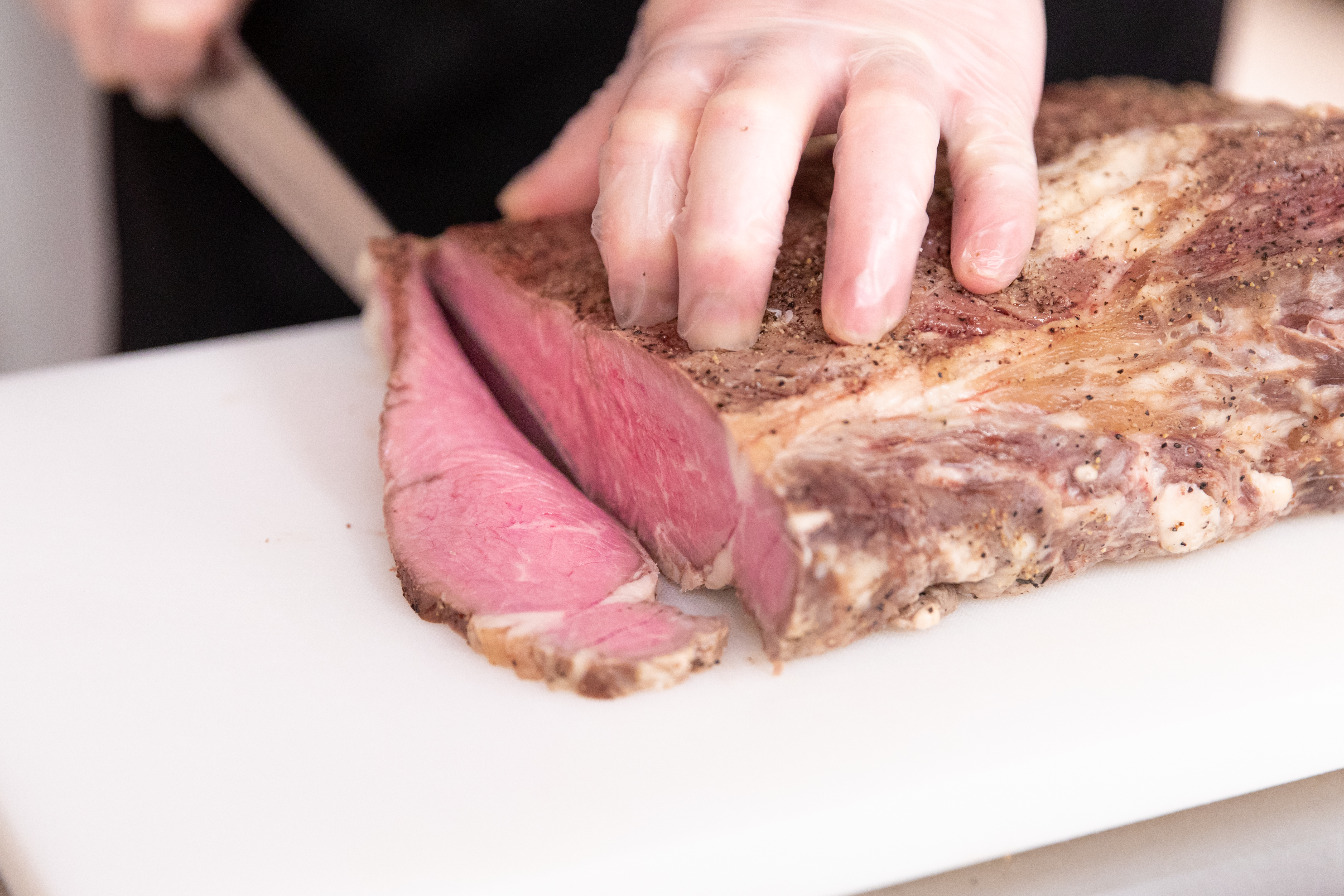 米沢牛や山形牛のような地域ブランドではなく、「蔵王牛」は蔵王高原牧場からのみ出荷される希少なドメーヌ(生産者単位)ブランド牛です。そのため高橋畜産グループの技術やこだわりがそのままお肉の個性になり、品質のバラつきがなくとても安定しています。血統は黒毛和牛とホルスタイン。黒毛和牛血統の脂の旨さと、ホルスタイン血統の野性味ある赤身肉の旨さを合わせ持った交雑種です。
