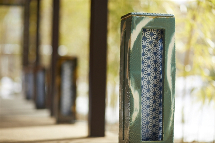 界 鬼怒川のいたる所で黒羽藍染に触れることができます。客室には小沼氏が手がけたベッドライナーや障子、クッションなどを設えています。中庭を囲む通路には麻の葉模様が施された藍染めの灯籠が並び、夕暮れ時になると暖かい光が足元を照らします。また、ツアー参加者の特典として、小沼氏が今回のために制作したオリジナルのバックをプレゼントしています。型染めで染め上げられた菊の柄と小沼氏オリジナルの模様の2種から選べぶことができ、館内を移動する際の小物入れにもぴったりです。