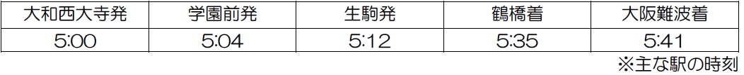 大和西大寺5時00分発大阪難波行き区間準急を新設し、大和西大寺からの始発列車を16分繰り上げます。(東花園で大阪難波行き普通にお乗り換え出来ます)