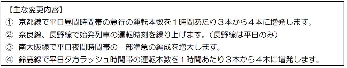 ・吉野5時57分発大阪阿部野橋行きを、橿原神宮前6時42分発大阪阿部野橋行きに変更します。