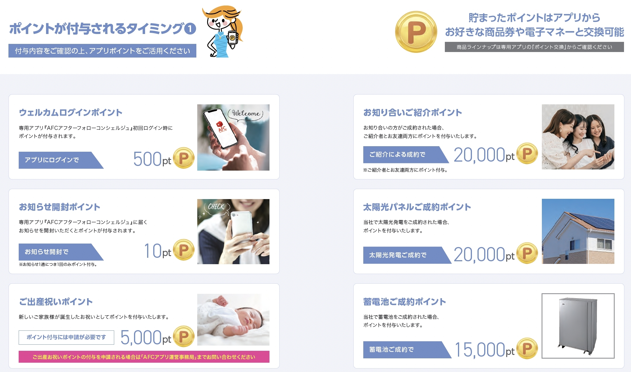「お知り合いご紹介による成約で20,000ポイント」「外装リフォームのご成約で10,000ポイント」など今後のお住まいに関する工事のご依頼でポイント付与がございます。