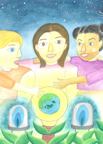 朝日からイメージしました。太陽の光を受けて世界中の人や自然や街並が輝いている。