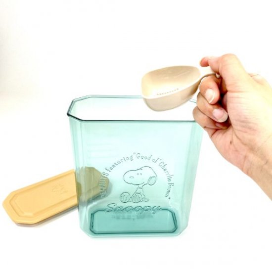 淡いブルーグリーンがキレイな、粉末保存ケースです。スッキリとシンプルなたたずまいですが、中央にはちゃんとスヌーピーが存在感を出しています。