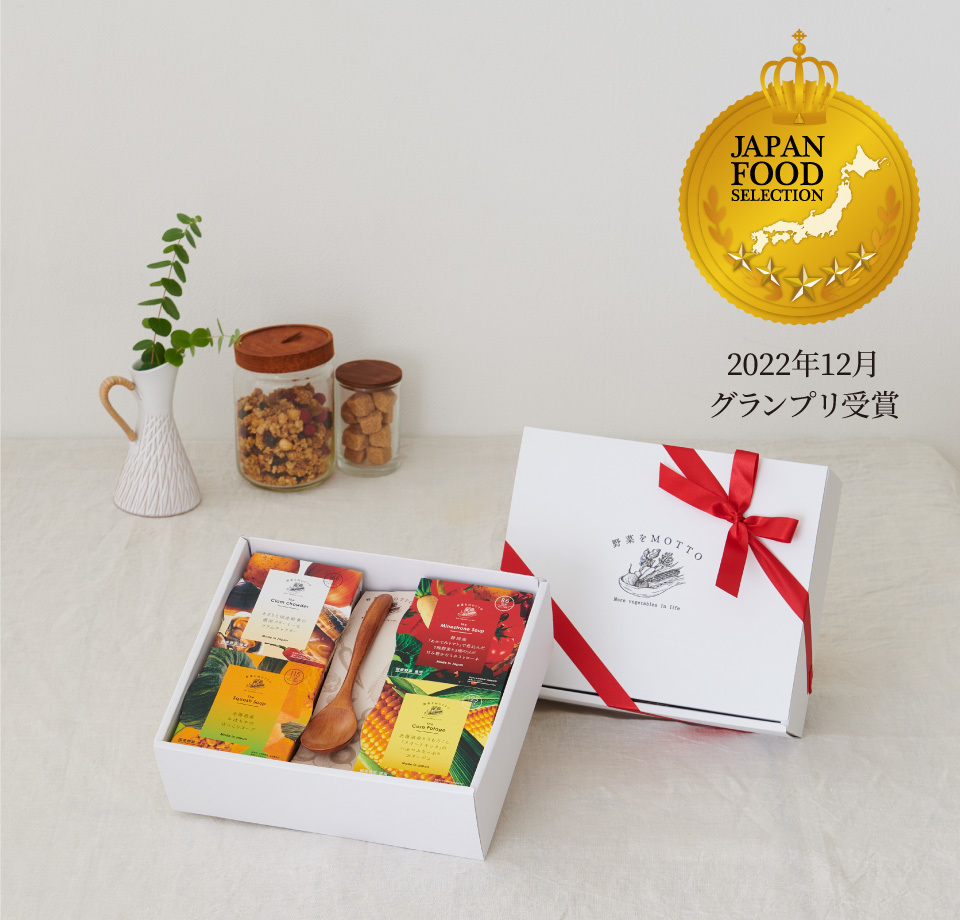 モンマルシェ株式会社(静岡県静岡市)は運営する国産野菜フードブランド【野菜をMOTTO】のスープ4個スプーン付きギフトセットが第58回ジャパン・フード・セレクションにてグランプリを受賞しました。素材の味が感じられることや具だくさんで満足感があるなど、味の面で高評価をいただき、最高賞であるグランプリを受賞いたしました。今後もさらに研究を重ね皆様においしいと感じていただける商品をお届けできるよう、このグランプリを励みにさらに商品開発に努めてまいります。