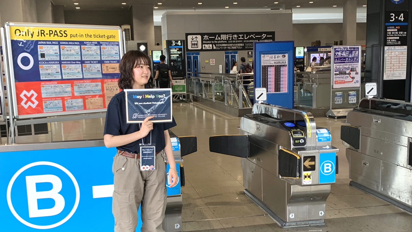 JR関西空港駅で海外からのお客様を中心に、券売機の使い方や乗換案内のサポートをしています。案内後Have a nice day!と声をかけると笑顔で「Thank you」と返してくれるので、それが嬉しくて、とてもやりがいを感じます。「実践的な英語力」が身に付くだけでなく、臨機応変な対応力も身に付きました。一緒に参加する大学生や留学生別科の方と協力が大切と実感しました。この活動では普段学内では交流することがない他の学生さんと友達になったり、ボランティアを通して自分の視野が広がりました。そして、この活動を通じて「海外の方と会話したい」とより思うようになりました。