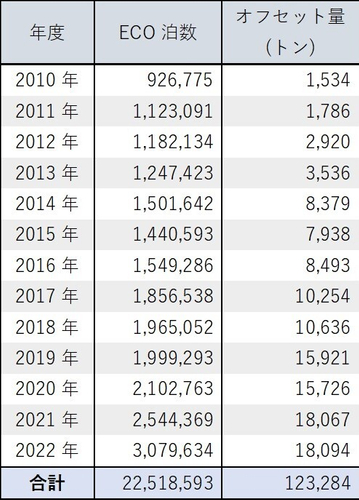「Natural, Organic, Smart」をコンセプトに、地球にも人にも優しいホテルの運営を手掛ける株式会社スーパーホテル(代表取締役社長:山本 健策、本社:大阪府大阪市)では、2010年3月から全店舗で実施しているカーボン・オフセット付き環境配慮型宿泊サービス「ECO泊」の累計宿泊数が2,000万泊を突破しました。スーパーホテルはカーボン・オフセットの仕組みを利用した脱炭素活動のリーディンググループとして13年目に重要な節目を迎えました。