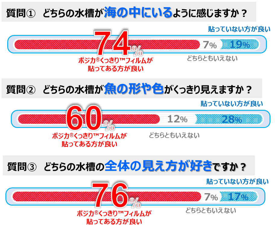 3つの設問に対し、ポジカを貼った水槽は、「海の中にいる感じがする」が74%、「魚の形が良く見える」が60%、「全体の見え方が好き」が76%の回答があり、明らかな有意差が出ました。ランダムな聞き取り調査では、「ポジカを貼っている水槽は水がクリアに見える」、「ポジカを貼っている水槽と貼っていない水槽の見え方は全く異なる」という回答もありました。また、ニフレルで飼育を担当するキュレーターの方々からも、「実際に海に潜った時に目の前に広がっていた見え方に近い感覚だ」との回答がありました。