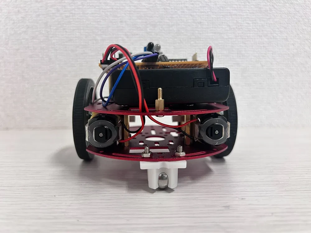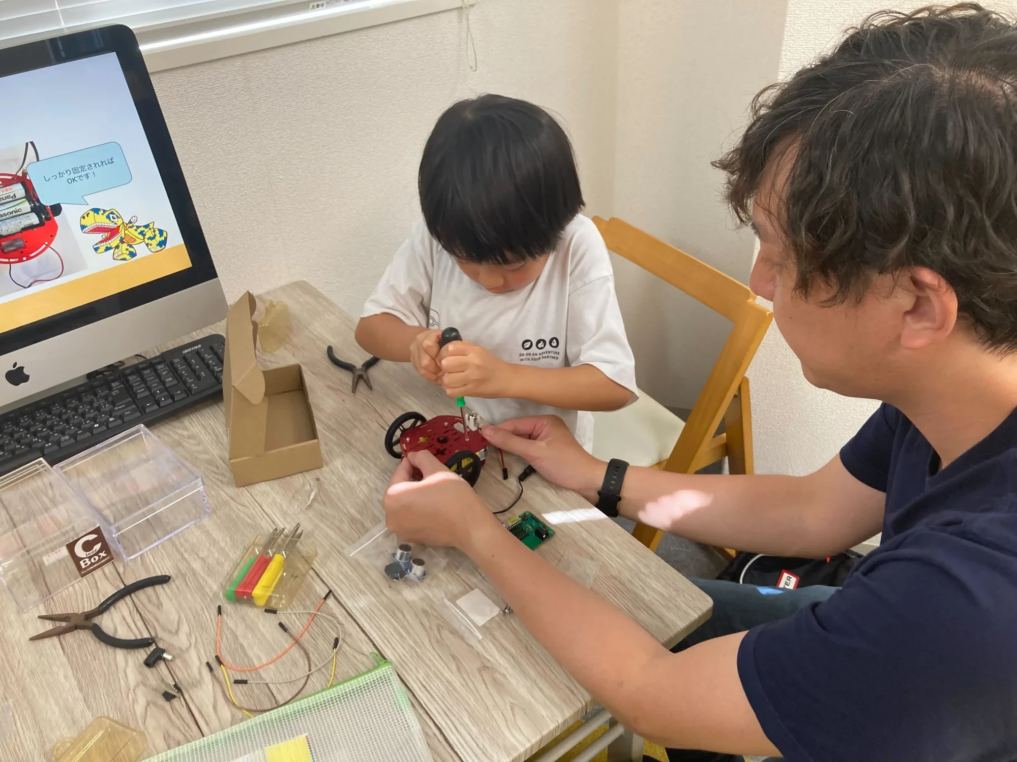 モーターやギアを組み立てて駆動部分を作り、基板・超音波センサーを取り付けて、障害物を回避するしくみをプログラミングで実現。