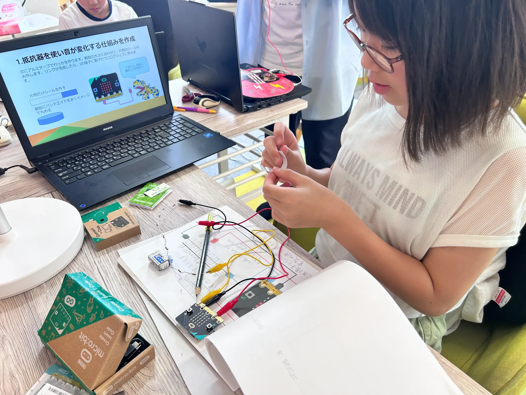 micro:bitにプログラミングを行い、電気の流れや音の変化を学びながら、電子工作×音楽×プログラミングの魅力を楽しく学べるコースです。