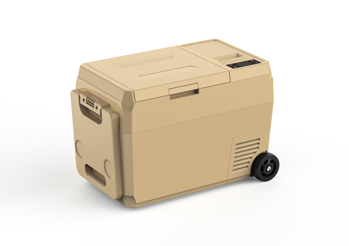 容量が大きくなった分、持ち運びの利便性を考え持ち手を追加。別売りのバッテリーを使用すれば、ポータブル電源なしでも冷蔵庫が稼働可能です。