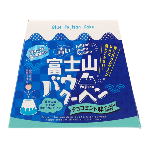 ほとんどのバウムクーヘンは外側も断面も淡い黄色や茶色ですが、「青い富士山バウムクーヘン」はその名の通り、外側はもちろん断面まで綺麗な青色。富士山の雪の部分はホワイトチョコレートで演出。ミントの風味にダークチョコのカカオが感じられ、冷やすとさらに清涼感が際立つチョコミント味のバウムクーヘンになります。