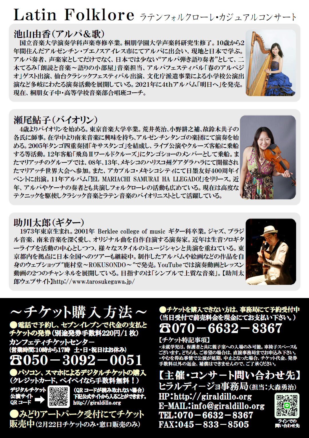 アルパ(ラテンハープ)、バイオリン、ギター、この三つの弦楽器による、ラテンアメリカ(中南米)の音楽を気軽に楽しんでいただくコンサートをお届けします。メキシコ、ペルー、ベネズエラ、アルゼンチン、ブラジル等の名曲で巡る中南米の旅。多様な先住民の伝統音楽とスペインやアフリカなどから伝わってきた音楽が融合し、それぞれの土地で独自性をはぐくみ、世界の人々に愛されてきた音楽の世界をお楽しみに!