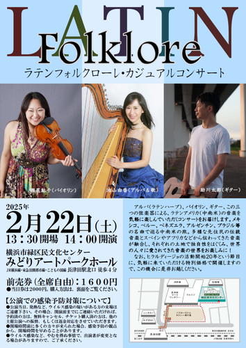 ヒラルディージョ事務局主催、『ラテンフォルクローレ・カジュアルコンサート』が2025年2月22日 (土)に横浜市緑区民文化センター みどりアートパーク(神奈川県 横浜市緑区 長津田 二丁目1番3号)にて開催されます。