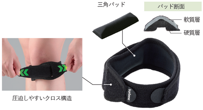 硬軟構造の三角パッドが脛骨粗面や膝蓋靭帯、大腿四頭筋腱のトラブルをピンポイントにサポートします。圧迫しやすいクロス構造で、骨や腱に負担のかかる膝屈曲時や筋肉が収縮したときに適度な圧迫がかかります。