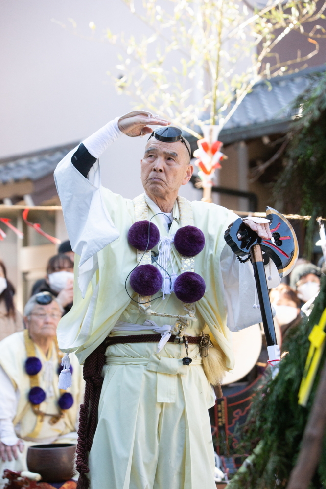 「護摩木(ごまぎ)」とよばれる木の片を不動明王の智慧の炎で燃やして、その年の厄除けと無病息災を祈る伝統儀式です。修験道の道を極めた山伏たちが、伝統作法のっとり弓や剣や斧を奉納する儀式を修めたのちに炎を護摩壇に点火します。高らかにあがる炎は人を魅了するものがあります。