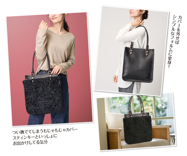 そんな姿を、もじゃもじゃの着脱可能なカバーで表現した、2Wayレザートートが登場しました。