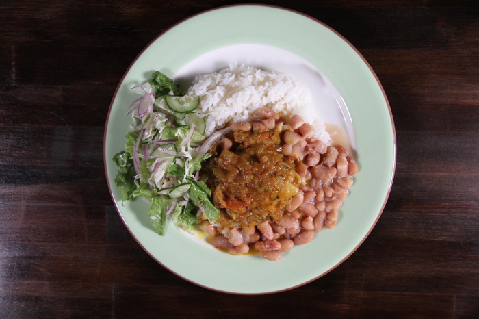 お米の上に煮込んだ豆と鶏肉のソースをかける「エストファドデポヨ コンフリホレス ¥1,400」