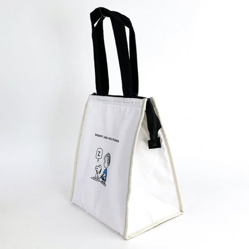 こちらもワンポイントシンプルなスクエアタイプのランチバッグです。内側には保冷を助ける加工がされています。サイズも縦長トートバッグ型なのでランチケースの上にデザートのフルーツや保冷材も乗せられます。