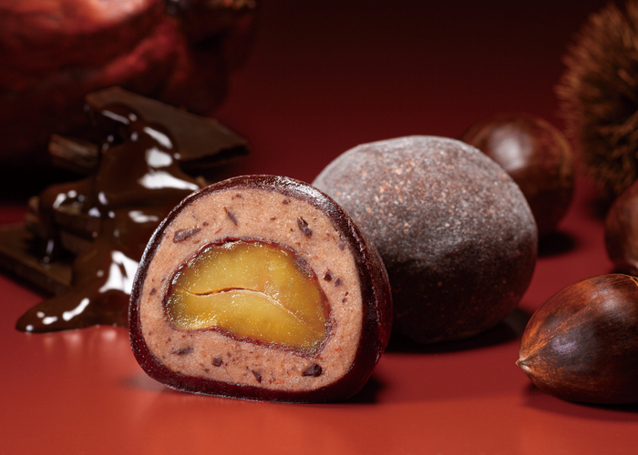 大粒な熊本県産渋皮つき和栗を一粒まるごと使用。カカオ80%のチョコを使用した洋風な栗あんに、芳醇な香りと深みが楽しめるカカオマスを練りこんだ大福生地で包みました。渋皮つき和栗ならではのコクと旨味に、ハイカカオの芳醇でちょっとビターな甘さが加わり、食べると思わずうっとりしてしまう11月の期間限定大福です。