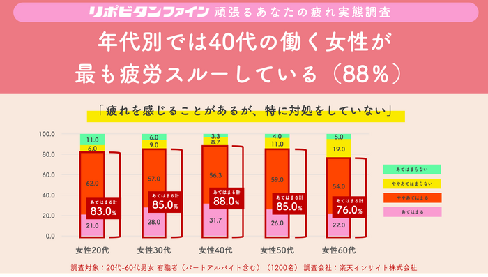 また「疲れを感じることがあるが、特に対処をしていない」という質問に対して、働く女性の中で年代別に結果を見てみると、20代女性83.0%、30代女性85.0%、40代女性88.0%、50代女性85.0%、60代女性76.0%と(いずれも「あてはまる」、「ややあてはまる」と答えた方の合計)、40代が最も“疲労スルー”状態の方が多いことが見て取れます。
