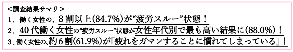 1. 働く女性の、8割以上(84.7%)が“疲労スルー”状態!