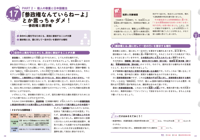 著者は普段、代々木ゼミナールという予備校で、大学受験生に政治経済や倫理を教えています。中学校の公民を難しくしたものですが、本書で学習しておけば、将来これらの科目を習うとき、難しく感じないでしょう。なぜなら公民の学習で大事なことは暗記よりも理解。本書で「なぜ? どうして?」という理解の土台を築いておけば、 その上にどれだけ難しい知識が乗ってきても、支えられるのです。