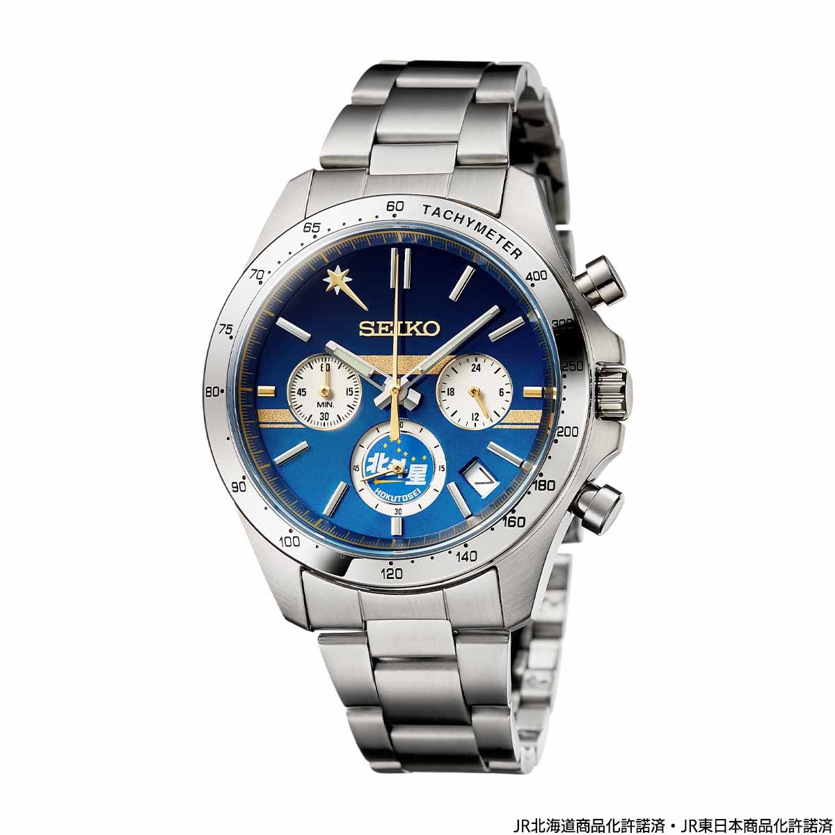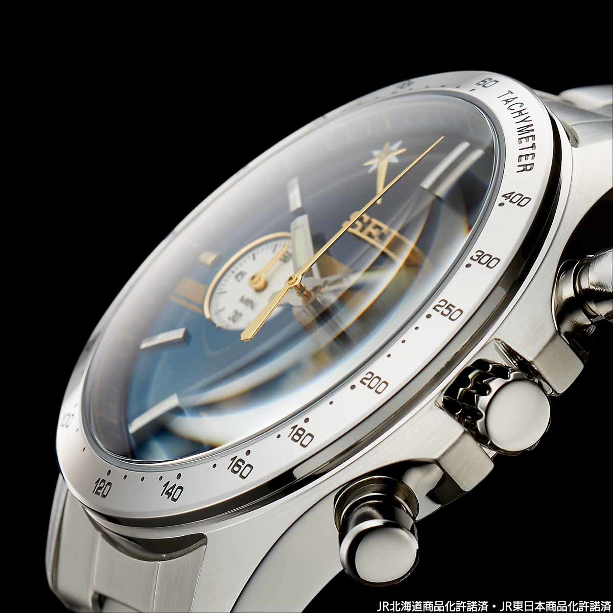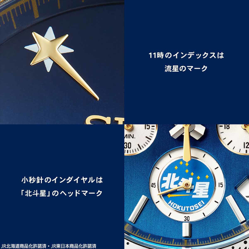文字盤は、函館から札幌の区間を走行していたDD51形機関車が牽引する「北斗星」の正面顔をイメージ。金の帯をデザインした深いブルーの文字盤に、「北斗星」のヘッドマークと前照灯を模したインダイヤルが配置されています。