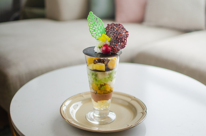 主役は、芳醇なカカオが香るチョコレートと、マンゴーやパッションフルーツの甘酸っぱさ、そして驚くほど爽やかな自家製「バジルのグラニテ」との意外なマリアージュ。食べ進めるごとに、パリパリのチョコディスクやフルーツの多彩な食感、グラニテのひんやりとした清涼感をお楽しみいただけます。チョコレートの上品な甘さとハーブが織りなす、まさに“大人のための贅沢”な新感覚パフェです。