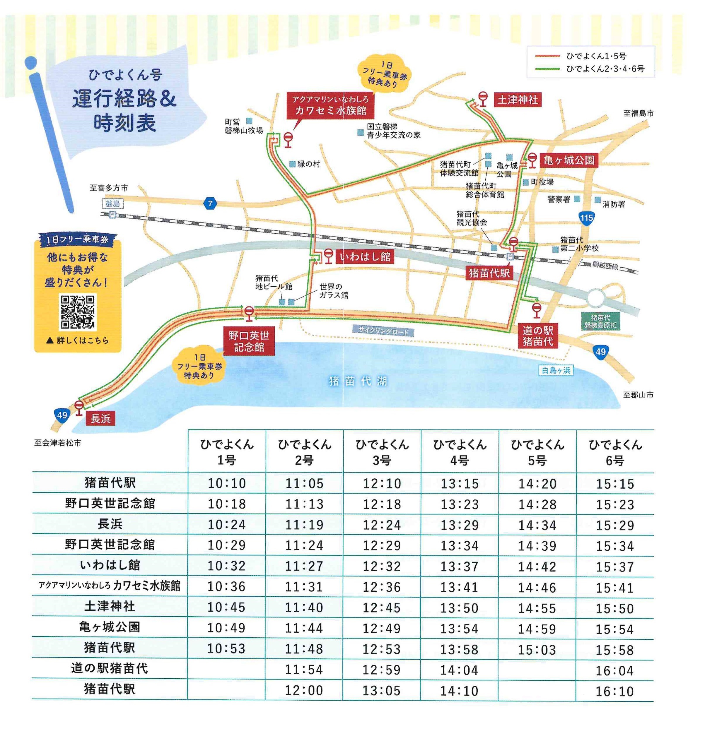 JR猪苗代駅、野口英世記念館、長浜、いわはし館、アクアマリンいなわしろカワセミ水族館、土津神社、亀ケ城公園、道の駅猪苗代の8施設を結びます。車体には一般的なバスよりも大きな窓が取り付けられており、車窓からの景色も楽しめます。
