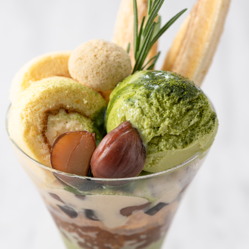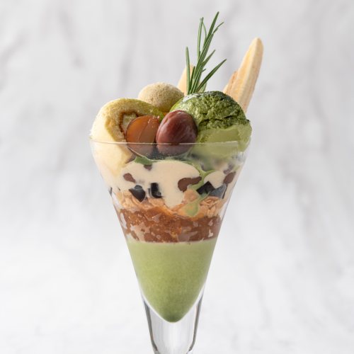 パフェの層は、豆乳で使った抹茶のパンナコッタをベースに、SOKOKOの「ほうじ茶」を使ったジュレ、中には「いんげん豆の煮豆」と「黒蜜風味ようかん」がアクセントに。「ドリームプリンカスタード」で作った濃厚クリームがサクサクとした有機コーンフレークと相性抜群。最後に「SONOKOアイス抹茶」「米粉ロールケーキ」、バナナや渋川栗、「カシューナッツクッキー」をトッピング。ひとつひとつのお味が楽しめる、贅沢でギルティフリーパフェです。