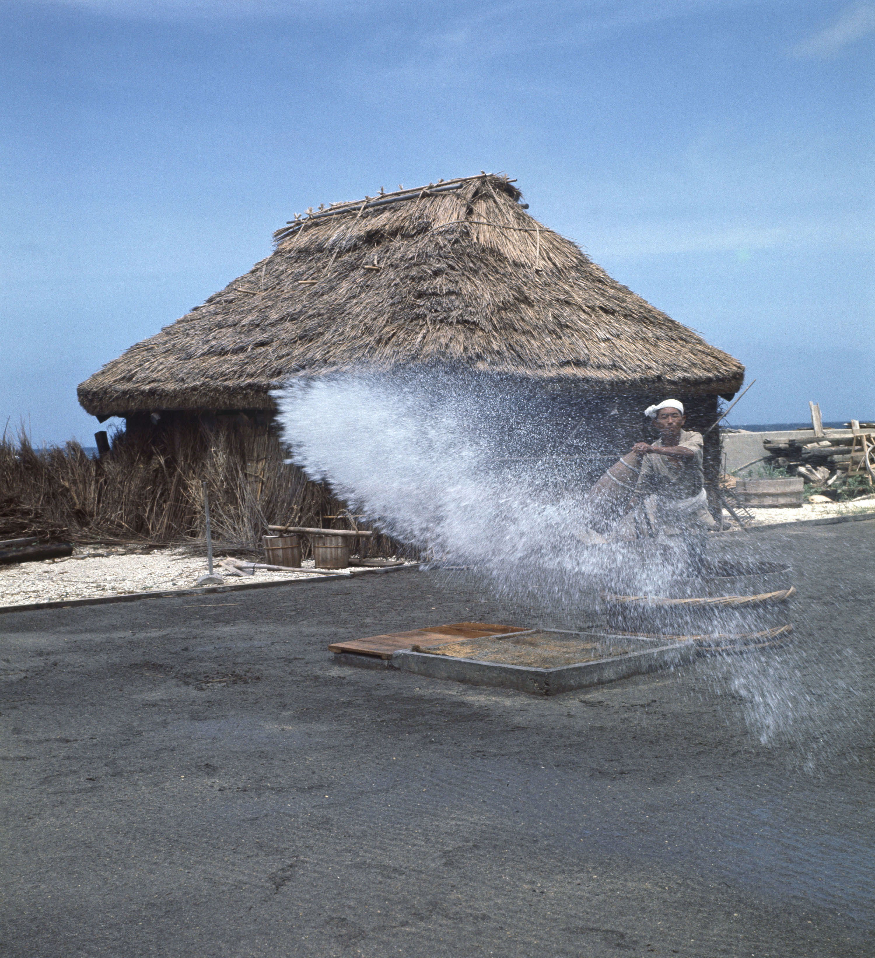 海水や塩水を原料にした塩作りでは、塩の結晶を取り出す前に、まず海水や塩水を濃くする必要があります。「濃くする方法」としては、太陽の熱を使うところが多いですが、火の熱を使うところもあります。さらには、温泉の熱を使うところもあります。