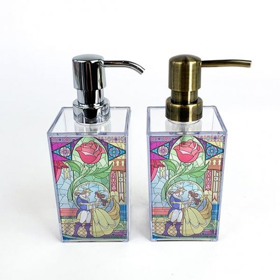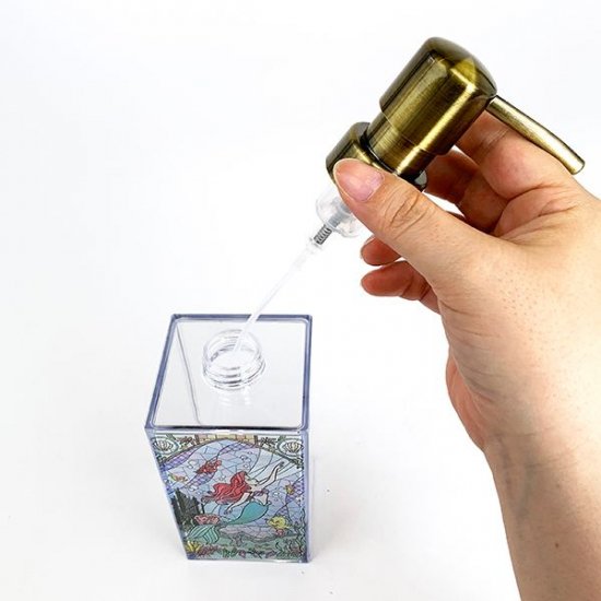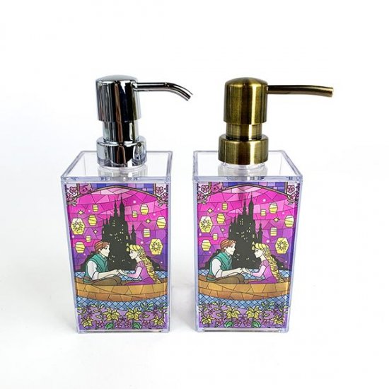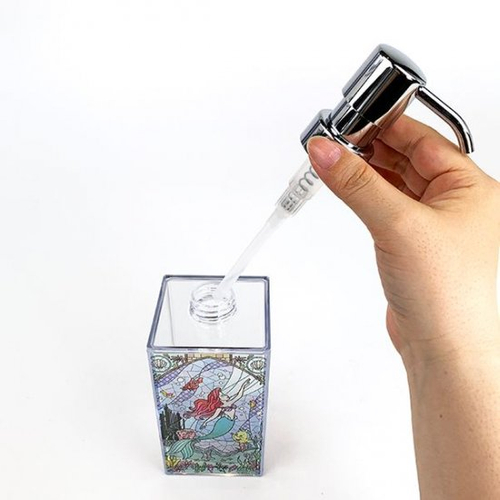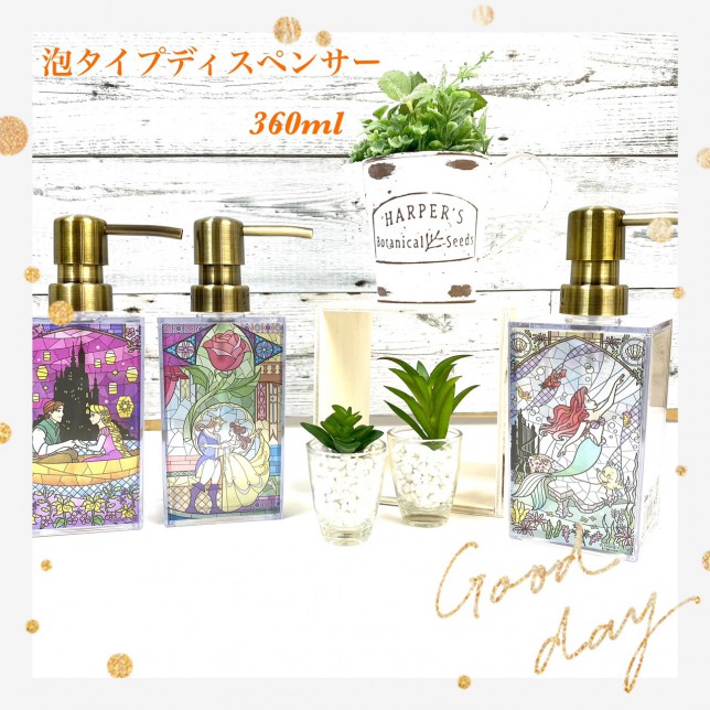 ディズニーのプリンセスが、キレイなステンドグラスのディスペンサーになって登場です。本当のステンドグラスのような仕上がりで、お風呂や洗面所がラグジュアリーに変身♪中身を入れることで雰囲気も変わって、いろいろな表情が楽しめますよ。