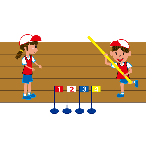 走っている時は前の走者に当らないよう、棒高跳の助走をヒントに両手で持ってちょっと立てて走ろう!テイクオーバーゾーンでは、長さ180cmの超ロングバトンがさく裂!ビヨ~ンと伸ばしてバトンタッチ!プカプカポールは水泳用品の遊具で重さ210g!両手で持てば軽い軽い。