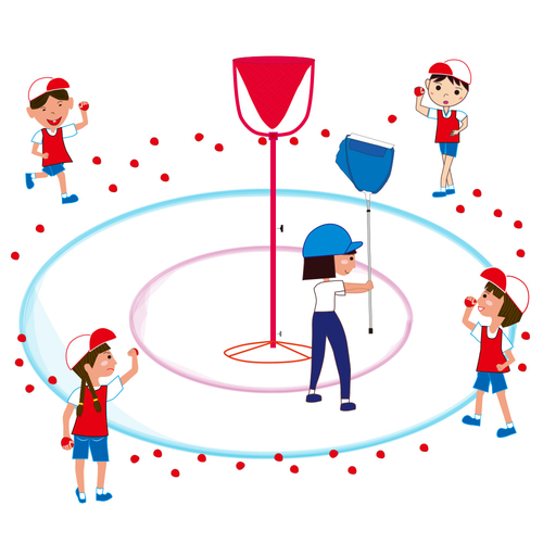 内側の円は半径2ⅿ程度。外側の円は半径4ⅿ程度。フィールドプレーヤーは、外円の外側からカゴを狙う。邪魔役のキーパーは、内側の円内には入れない。1人でなく2人でも3人でもいい。