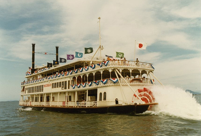 赤いパドルが目印の外輪船ミシガンは、1982年(昭和57年)4月29日に就航した、びわ湖を代表する観光船です。就航当初は「びわ湖にロマンを乗せて さあ、アメリカがやって来る。」をキャッチコピーに、アメリカ・ミシシッピ川を往来した蒸気船をモチーフにした外観と豪華な内装、本格的なディナーをご提供するレストランシップの先駆けとして人気を博しました。また、滋賀県と友好姉妹県州であるアメリカ・ミシガン州から国際友好親善のために来日した「国際交流研修生」がミシガン船内でサービス研修を行う姿は全国的な話題となりました。