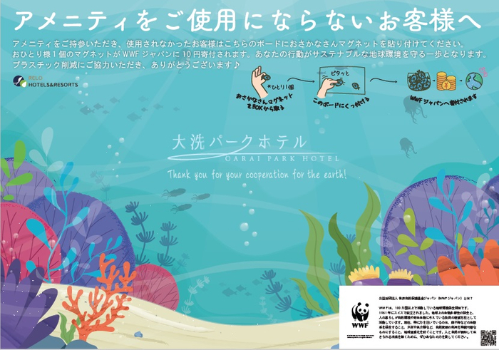 歯ブラシやカミソリ等、施設のアメニティを使用されなかったお客様がロビーに設置されたアートボードにマグネットを貼り付けていただくと、マグネットひとつ(おひとり様)につき、10円が環境保全団体WWFジャパンに寄付されます。「大洗パークホテル」「ゆとりろ那須塩原」にて試験的に導入。今後他施設でも展開予定。